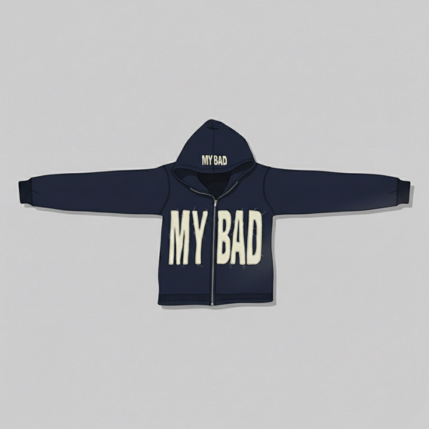 The MY BAD Navy Blue Hoodie keeps it simple with a statement that says just enough.